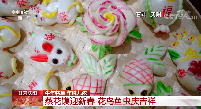 北方多地都有著過年蒸花饃的習(xí)俗。在甘肅慶陽,花饃也叫做年饃,圖案多以花鳥魚蟲為主,捏成壽桃等形狀,寄托著人們對(duì)美好生活的向往。