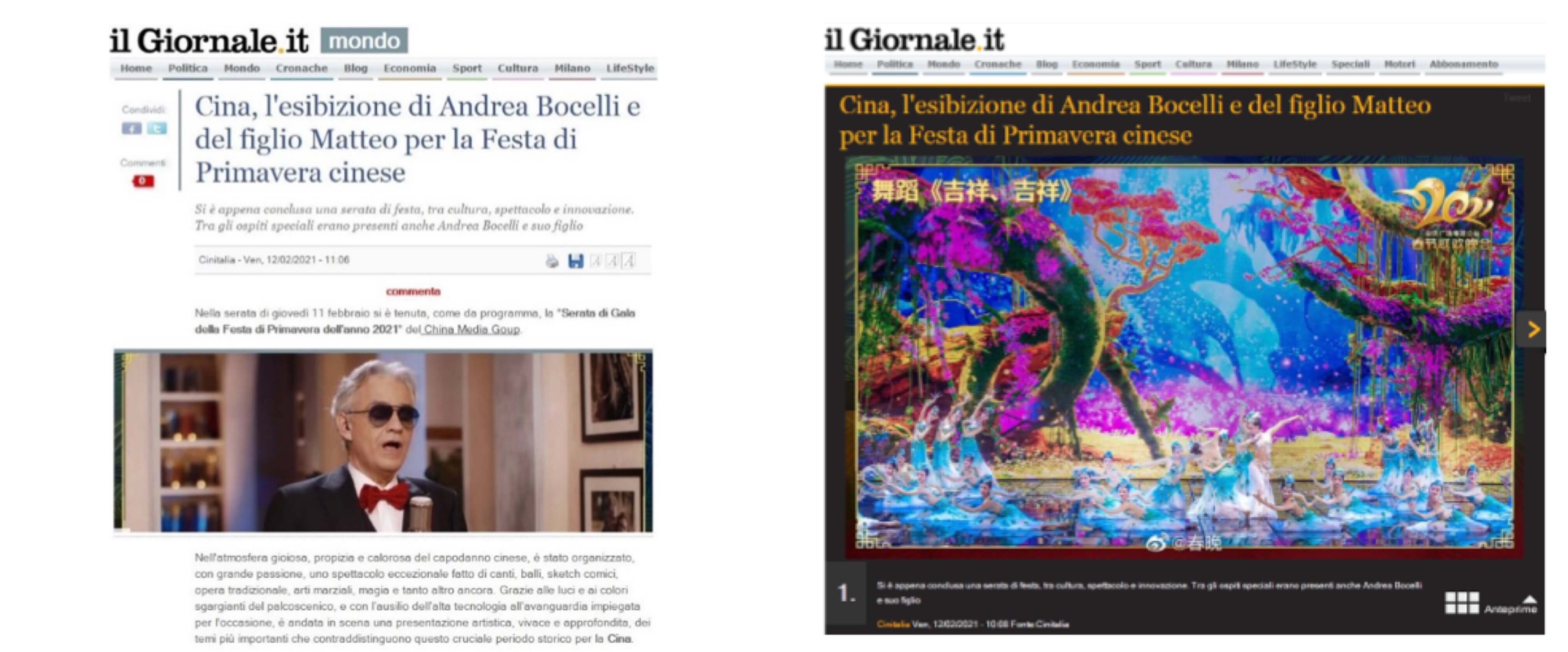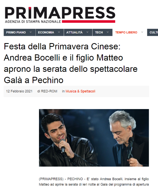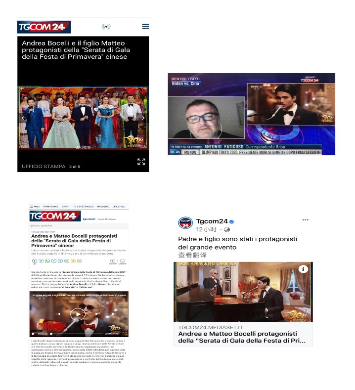 意大利重要的全國性報紙之一《日報》在網站發表題為《波切利父子春晚獻唱賀新春》的文章。文章寫道,中央廣播電視總臺春節聯歡晚會以歌舞、小品等形式,將建黨百年、疫情防控等主題生動呈現。意大利歌唱家波切利父子在晚會中演唱《我的太陽》等歌曲。意大利網友在社交媒體紛紛留言,表示愿中意兩國人民友誼長存。意大利最大的電視臺及新聞網站Tgcom24、意大利Teleambiente電視臺在晚間資訊欄目、意大利全國性通訊社Primapress分別發表了相關報道。