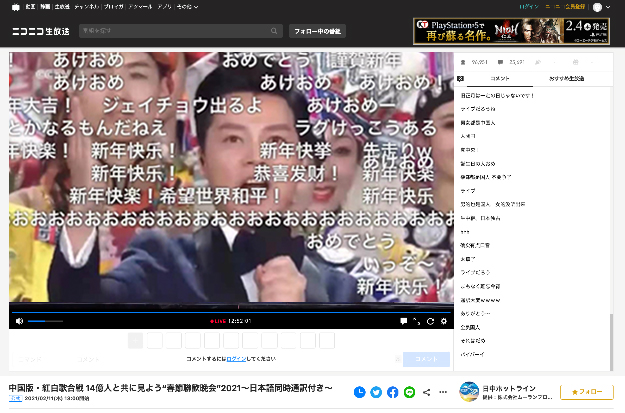 日本最大的視頻網站Niconico用日語同聲傳譯的方式,連續第六年對總臺春晚進行全程直播,引發日本民眾的廣泛關注和熱烈反響,實時在線觀看人數9.74萬人,彈幕評論數超過2.6萬條,節目好評率達91.7%。日本網友發彈幕評論稱“新年快樂”“中日友好”“舞臺設計很棒”“中國的技術現在已經遠遠超過日本”等。