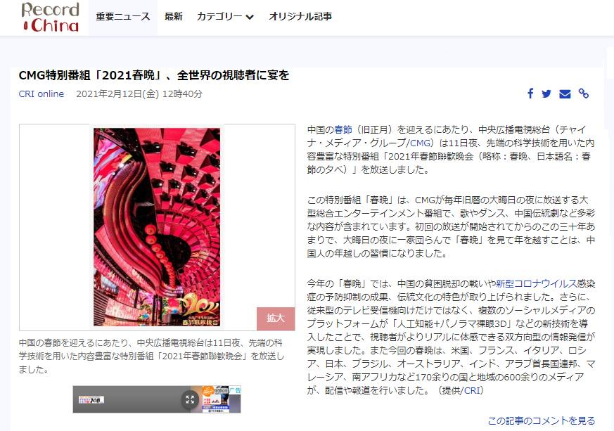 日本最大的中國資訊網站Record China發布報道稱,今年的春晚聚焦中國脫貧攻堅的成就、新冠疫情防控的戰略性成果等,緊扣時代主題,同時充分展示了中國的傳統文化。此外,新技術的應用也為觀眾們打造了一場令人震撼的視聽盛宴。
