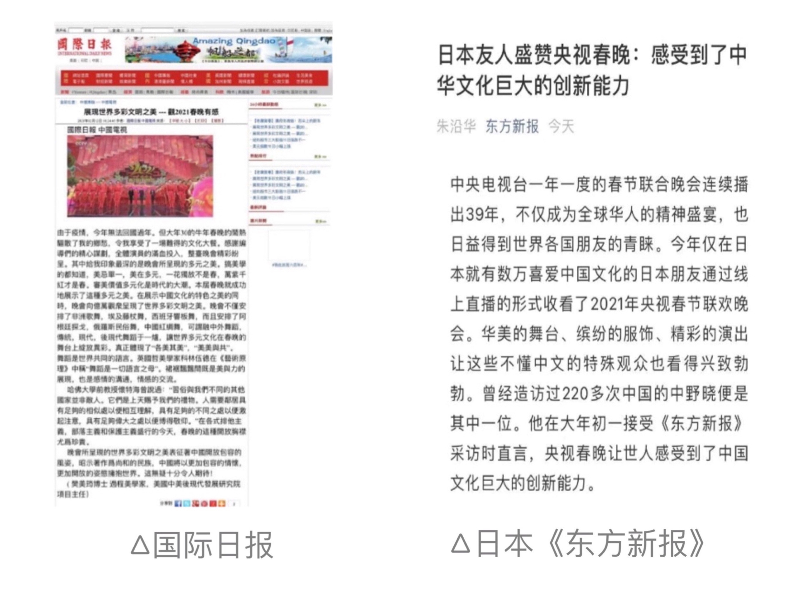 境外多家華文媒體高度評價春晚盛況,美國《國際日報》發表了題為《展示世界多彩文明之美——觀2021春晚有感》的文章表示,本屆春晚在展示中國文化的特色之美的同時,向億萬觀眾呈現了世界多彩文明之美。日本《東方新報》刊文表示,通過春晚日本友人感受到了中國文化巨大的創新能力及未來的無限可能。報道指出,當代中國對于優秀傳統文化精粹的挖掘、繼承、發展和傳播所取得的成就令人矚目。