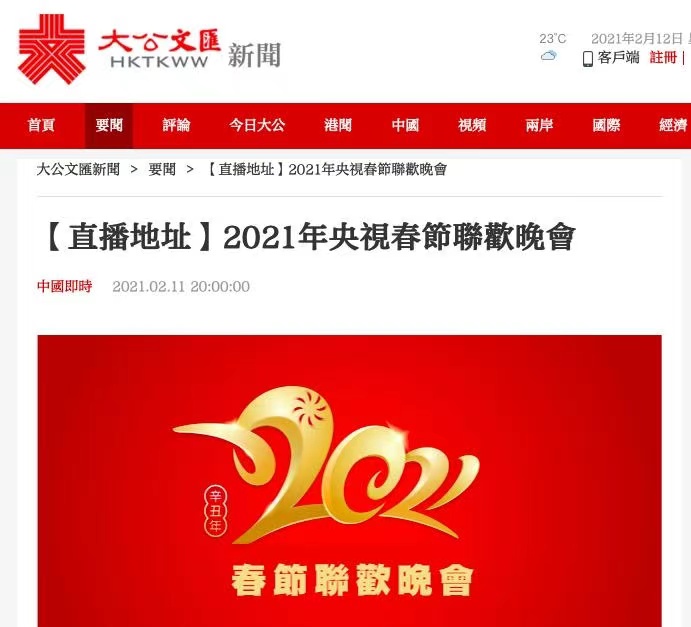 香港電視廣播有限公司(TVB)全程直播了春晚,大公文匯、《香港商報》、橙新聞也在新媒體平臺上進行網絡在線直播或摘播,吸引大量觀眾實時收看,并引起強烈反響。澳門廣播電視公司及旗下新媒體平臺澳廣視網站對春晚進行了轉播。