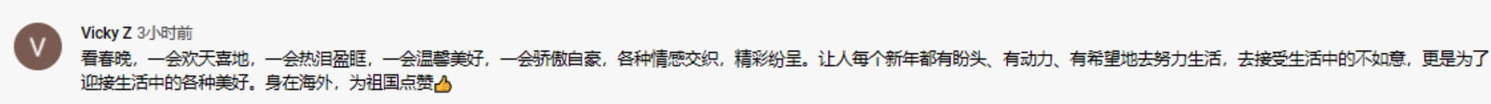海外網友Vicky Z留言:“看春晚,一會歡天喜地,一會熱淚盈眶,一會溫馨美好,一會驕傲自豪,各種情感交織,精彩紛呈。讓人每個新年都有盼頭、有動力、有希望地去努力生活,去接受生活中的不如意,更是為了迎接生活中的各種美好。身在海外,為祖國點贊!