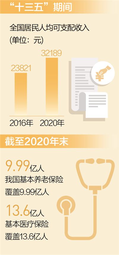 “十三五”期間,我國民生保障力度不斷加大。基本養老金連續多年調整,退休人員獲得感、幸福感、安全感持續增強。截至2020年末,我國基本養老保險覆蓋9.99億人,基本醫療保險覆蓋13.6億人,織成了一張世界最大的社會保障網。