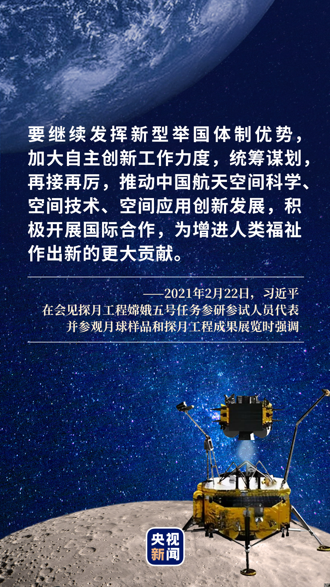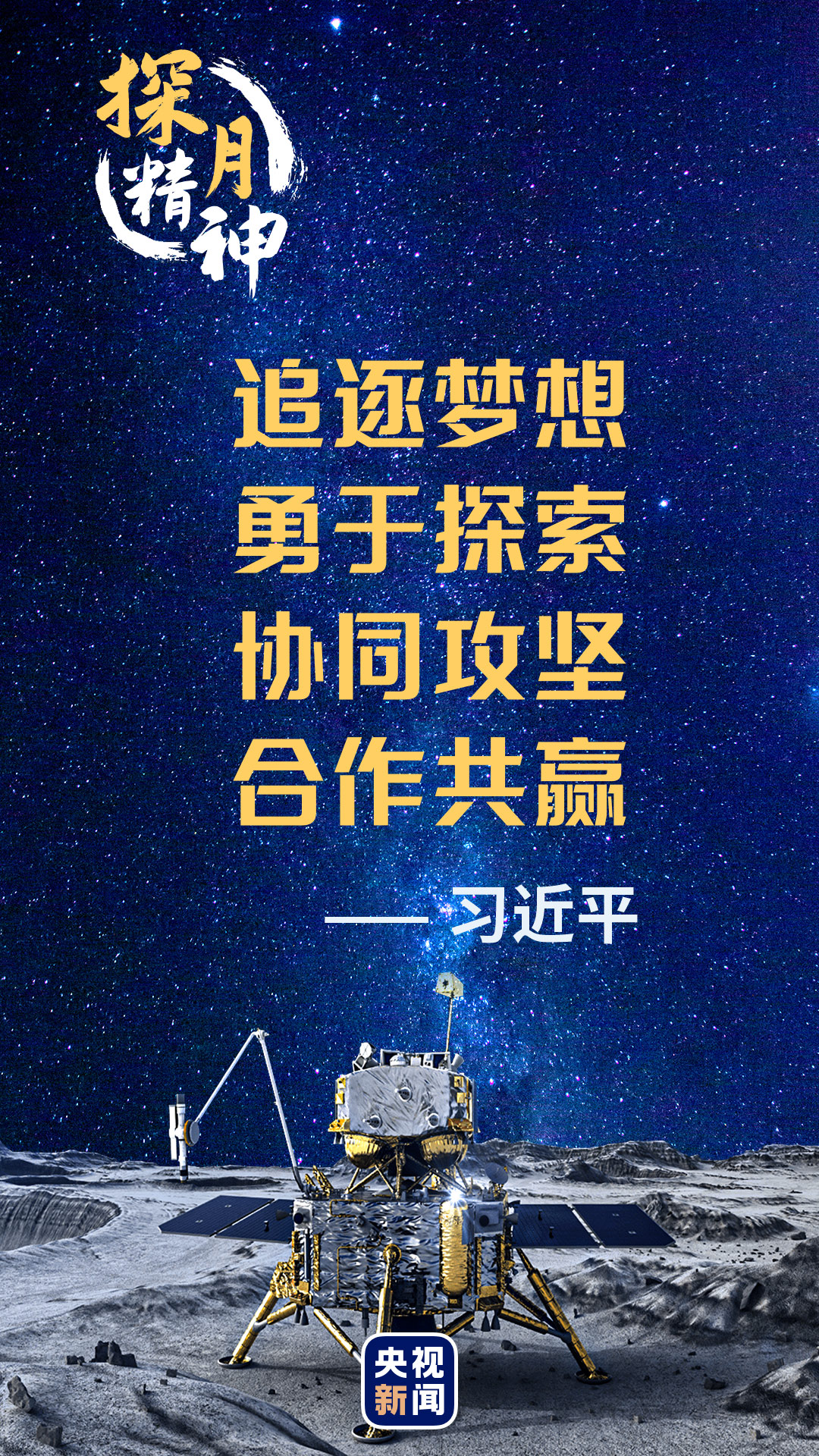 “要弘揚探月精神,發揮新型舉國體制優勢,勇攀科技高峰,服務國家發展大局,一步一個腳印開啟星際探測新征程,不斷推進中國航天事業創新發展,為人類和平利用太空作出新的更大貢獻。”這是習近平對探月工程取得成就的充分肯定,也是對我國航天人提出新的更高要求。