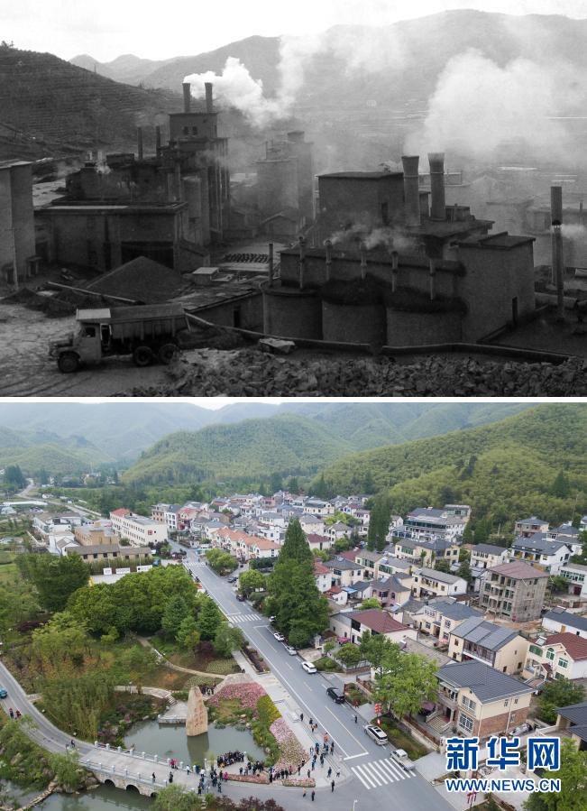 拼版照片:上圖為浙江省湖州市安吉縣天荒坪鎮余村上世紀八十年代的資料照片;下圖為2018年4月24日,游客在整修一新的余村游覽拍照(新華社記者翁忻旸攝)。
