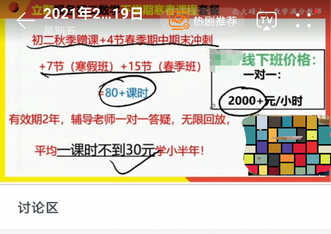 2020年秋季學期,北京市朝陽區的曾莉(化名)給初一的女兒報名了線下數學一對一輔導班!耙淮握n(2小時)收費2000元,每周兩次課。一個月交16000元!