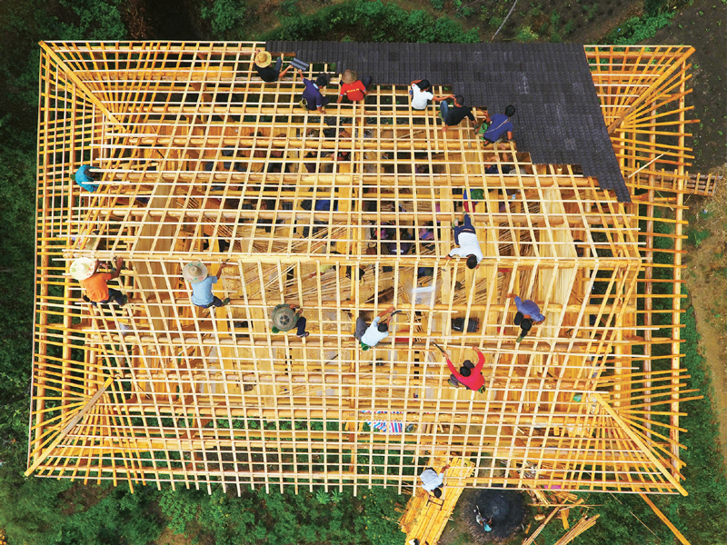 全面小康大家一起走。廣東廉江市和廣西融水苗族自治縣自2017年9月結成對子,開展“攜手奔小康”幫扶工作,針對山區群眾建房材料運輸成本高等實際困難,加大對貧困群眾危舊房改造的補助力度,幫助他們實現安居夢。圖為2019年9月3日,在黔桂烏英苗寨,群眾正在幫助貧困戶修建新木樓。 新華社記者 黃孝邦/攝