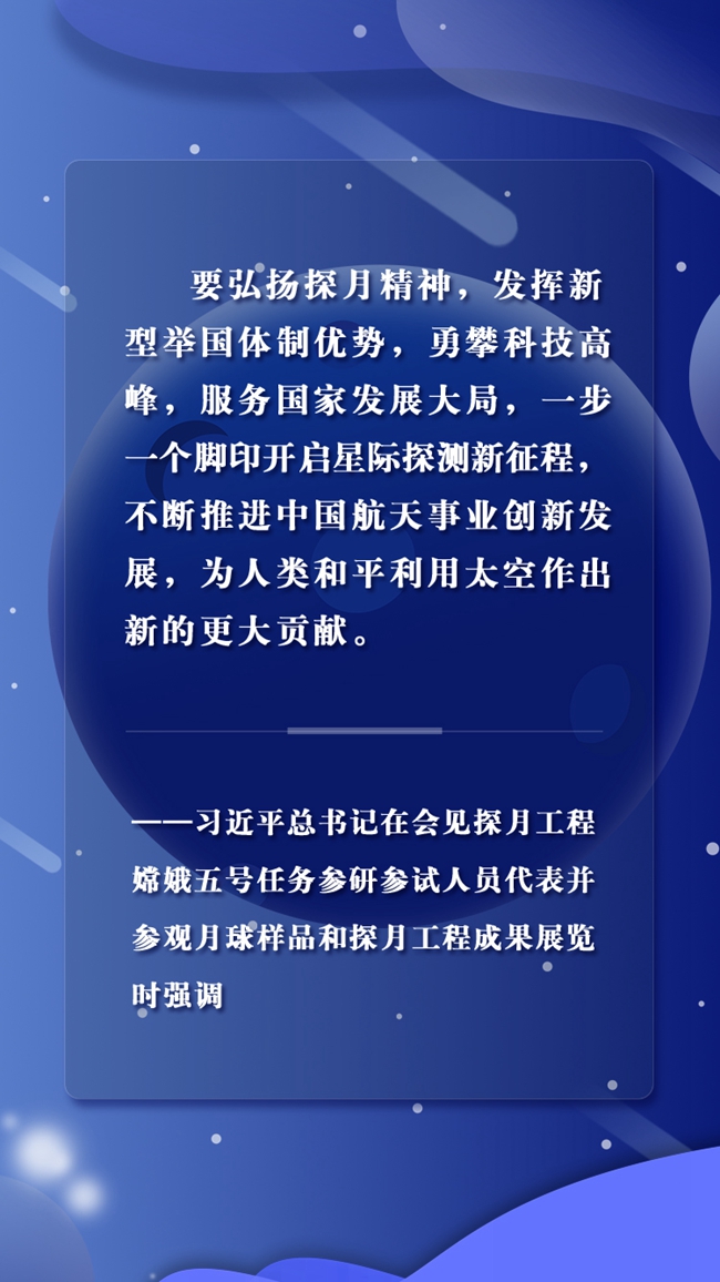 近日,在會(huì)見(jiàn)探月工程嫦娥五號(hào)任務(wù)參研參試人員代表并參觀月球樣品和探月工程成果展覽時(shí),習(xí)近平總書(shū)記充分肯定探月工程特別是嫦娥五號(hào)任務(wù)取得的成就,對(duì)航天工作者弘揚(yáng)探月精神,開(kāi)啟星際探測(cè)新征程寄予殷殷期望。