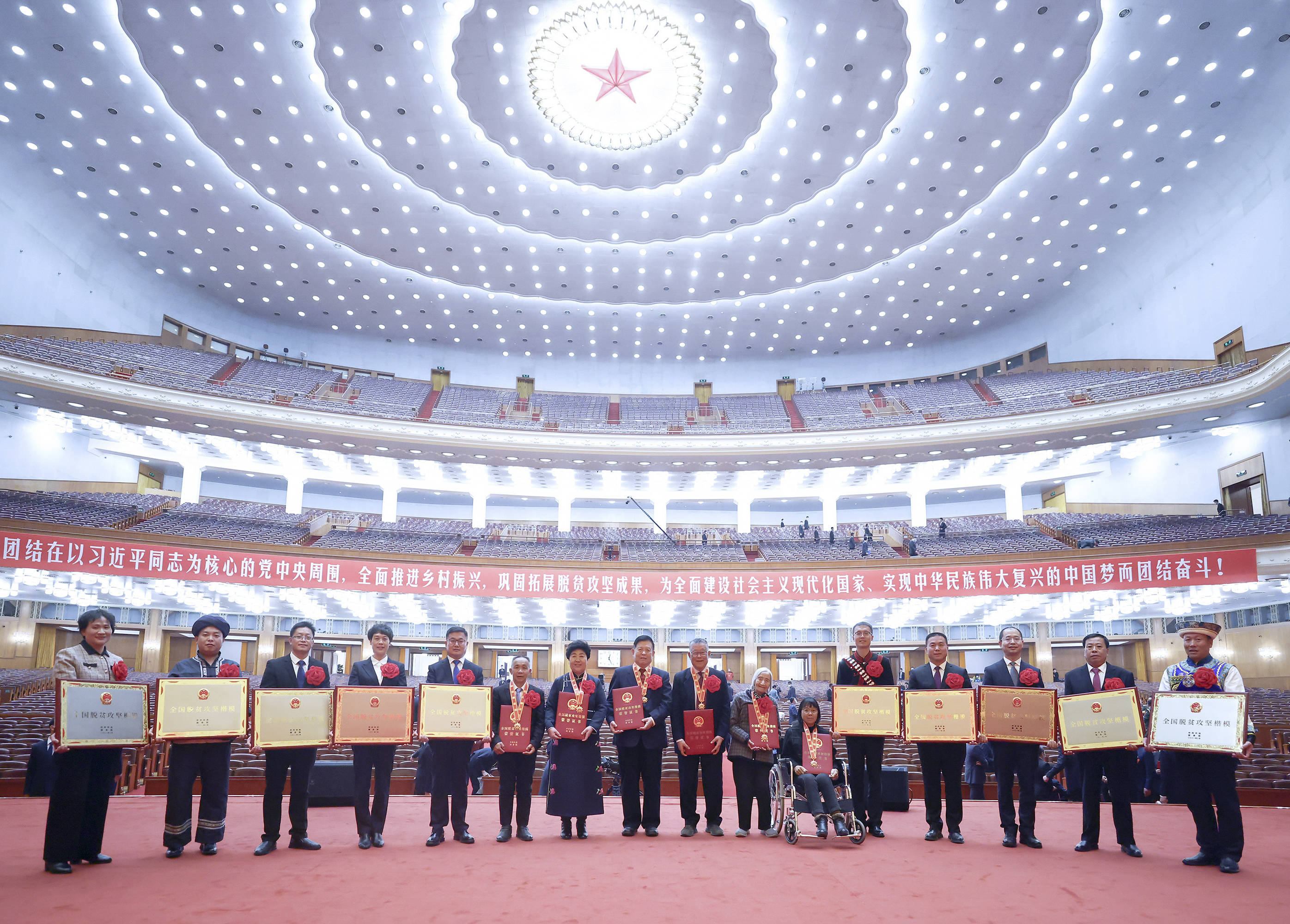 照片上,人民大會堂大禮堂標志性的璀璨天頂,燦若星河。剛剛受到表彰的全國脫貧攻堅楷模榮譽稱號獲得者,胸戴獎章、大紅花,手捧證書、獎牌,聚攏在一起。