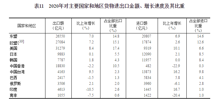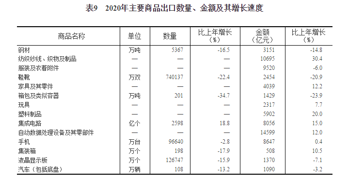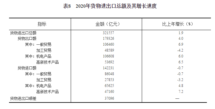 2020年貨物進出口總額321557億元,比上年增長1.9%。其中,出口179326億元,增長4.0%;進口142231億元,下降0.7%。貨物進出口順差37096億元,比上年增加7976億元。對“一帶一路”沿線國家進出口總額93696億元,比上年增長1.0%。其中,出口54263億元,增長3.2%;進口39433億元,下降1.8%。