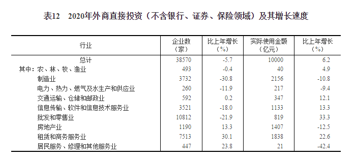 2020年外商直接投資(不含銀行、證券、保險領域)新設立企業38570家,比上年下降5.7%。實際使用外商直接投資金額10000億元,增長6.2%,折1444億美元,增長4.5%。其中“一帶一路”沿線國家對華直接投資(含通過部分自由港對華投資)新設立企業4294家,下降23.2%;對華直接投資金額574億元,下降0.3%,折83億美元,下降1.8%。2020年高技術產業實際使用外資2963億元,增長11.4%,折428億美元,增長9.5%。