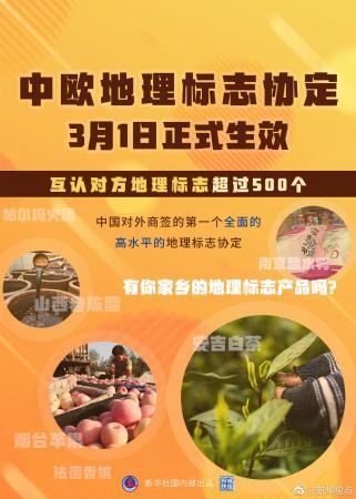 新華社北京3月1日電(記者 于佳欣)中歐地理標(biāo)志協(xié)定今起生效。首批“上榜”的中歐各100個地理標(biāo)志即日起受到保護(hù),這意味著中國和歐盟的更多特色優(yōu)質(zhì)名品將進(jìn)入彼此市場,不僅將更好保護(hù)中歐企業(yè)權(quán)益,也會讓雙方消費者買得放心。