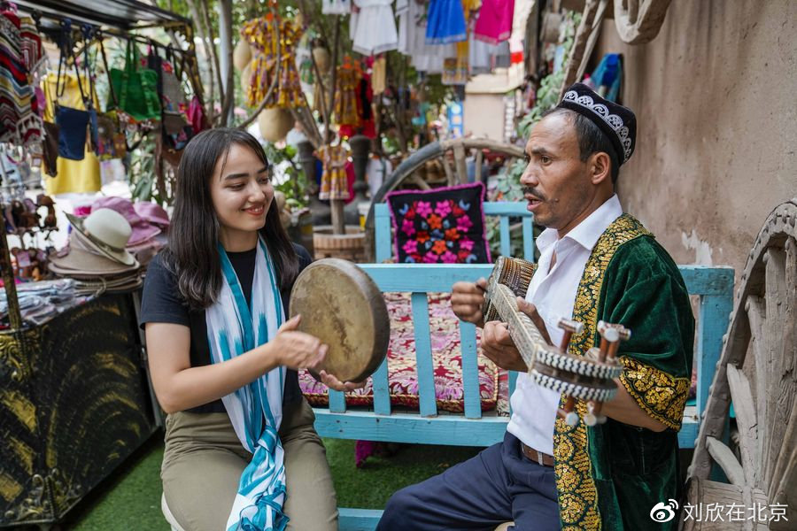 △在喀什古城景區(qū)阿熱亞路“古麗的家”特色庭院里,當?shù)鼐用裱葑鄻菲魑慰偷絹恚?019年7月9日攝)。新華社記者 趙戈 攝