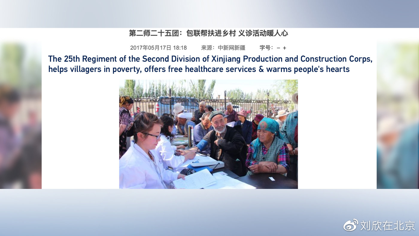 但是,你看一看照片,照片中居于中心位置的人其實都上了年紀,不像是處于育齡的人群。原來這張照片取自一個中國新聞網(wǎng)站,是關于新疆某地的扶貧項目,當?shù)厝嗣衩赓M進行身體檢查和咨詢。這說明了什么問題?有沒有可能由于他不懂漢語,或者他從來沒有去過新疆,所以搞錯了?