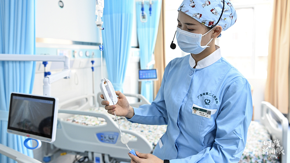 △廣東省第二人民醫(yī)院工作人員在5G智慧病房?jī)?nèi)演示“智能輸液監(jiān)測(cè)器”的功能。