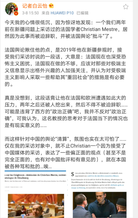 另外,這名反華記者還將梅斯特教授此前在斯特拉斯堡大學(xué)里推動發(fā)展與中國的學(xué)術(shù)合作,歡迎孔子學(xué)院來該校辦學(xué),受邀參加過中國大使館在當(dāng)?shù)嘏e行的西藏活動,以及在此次新冠疫情期間發(fā)表的肯定中國防疫措施的言行,也都作為了攻擊梅斯特教授的“黑材料”。