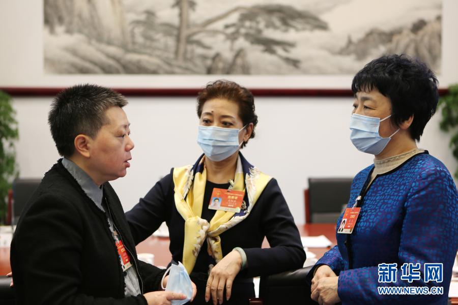 3月6日,十三屆全國人大四次會議天津代表團(tuán)的孔曉艷代表(左)、關(guān)牧村代表(中)和馬杰代表在會議間隙交流討論。新華社記者 吳雨 攝