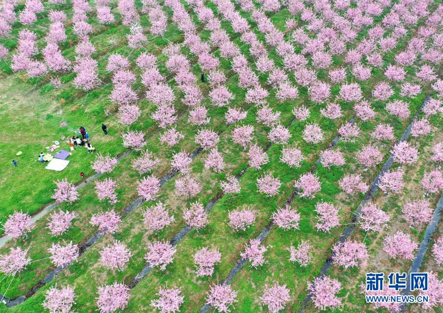 3月13日,游客在全椒縣馬廠鎮龍山櫻花園踏青游玩(無人機照片)。