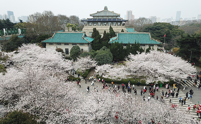 3月13日,來自各地的援鄂醫(yī)護人員在武漢大學校園共赴櫻花之約(無人機照片)。