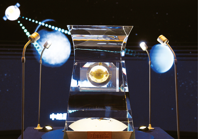 2020年12月17日,嫦娥五號返回器攜帶月球樣品安全著陸,中國探月工程“繞、落、回”三步走規劃如期完成,首次實現我國地外天體采樣返回。圖為2021年2月27日在中國國家博物館拍攝的月球樣品001號。 新華社記者 金良快/攝