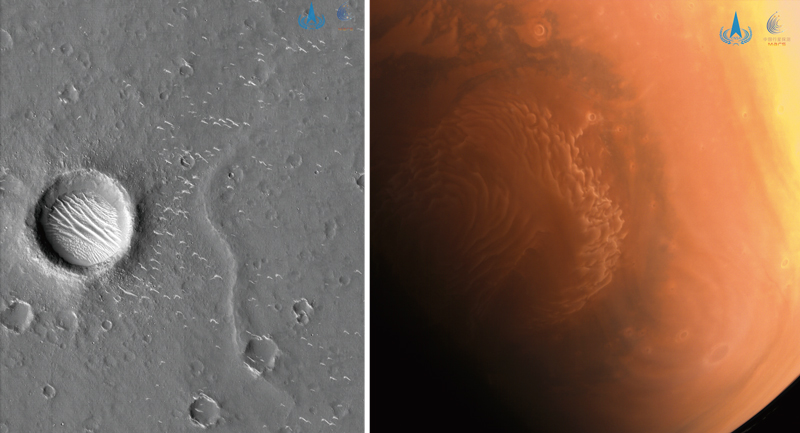 2021年3月4日,國家航天局發布3幅由我國首次火星探測任務“天問一號”探測器拍攝的高清火星影像圖。左圖為其中一幅全色圖像,由高分辨率相機在距離火星表面約330千米至350千米高度拍攝,分辨率約0.7米,成像區域內火星表面小型環形坑、山脊、沙丘等地貌清晰可見;右圖為彩色圖像,由中分辨率相機拍攝,畫面為火星北極區域。 新華社發 國家航天局供圖
