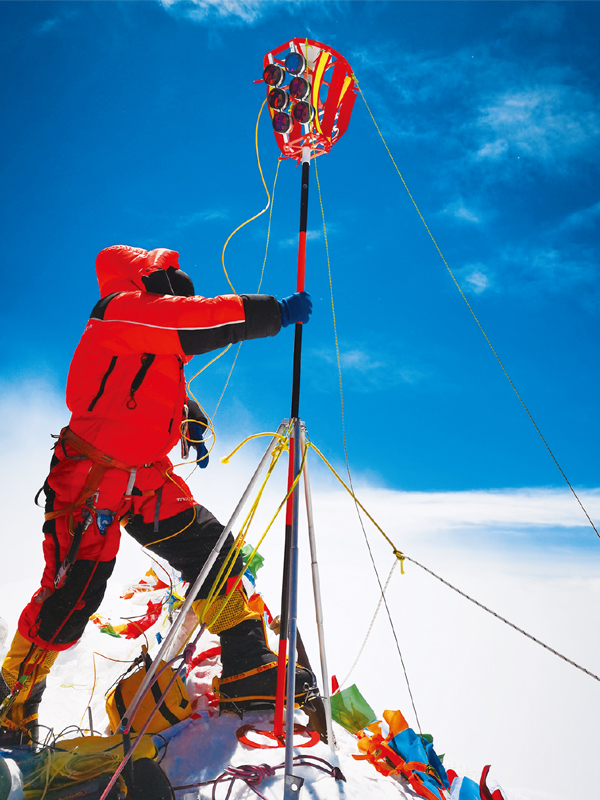 2020年12月8日,中國和尼泊爾共同向世界宣布,珠穆朗瑪峰的最新雪面高程為8848.86米。2020珠峰高程測量,將我國自主研制的北斗衛星導航系統首次應用于珠峰峰頂大地高的計算,獲取了更長觀測時間、更多衛星觀測數量的數據;GNSS接收機、長測程全站儀、重力儀等國產儀器全面擔綱,指標精度達到了世界先進水平。圖為2020年5月27日珠峰高程測量登山隊隊員在峰頂開展測量工作。 新華社特約記者 扎西次仁/攝