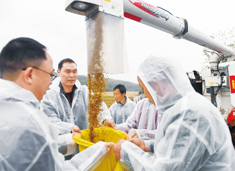 2020年11月2日,湖南衡南雙季晚稻試驗示范基地傳來消息:由袁隆平院士團隊培育的第三代雜交水稻“叁優一號”測產結果公布,雙季畝產突破1500公斤。圖為當日工作人員將稻谷裝袋。 新華社記者 陳澤國/攝