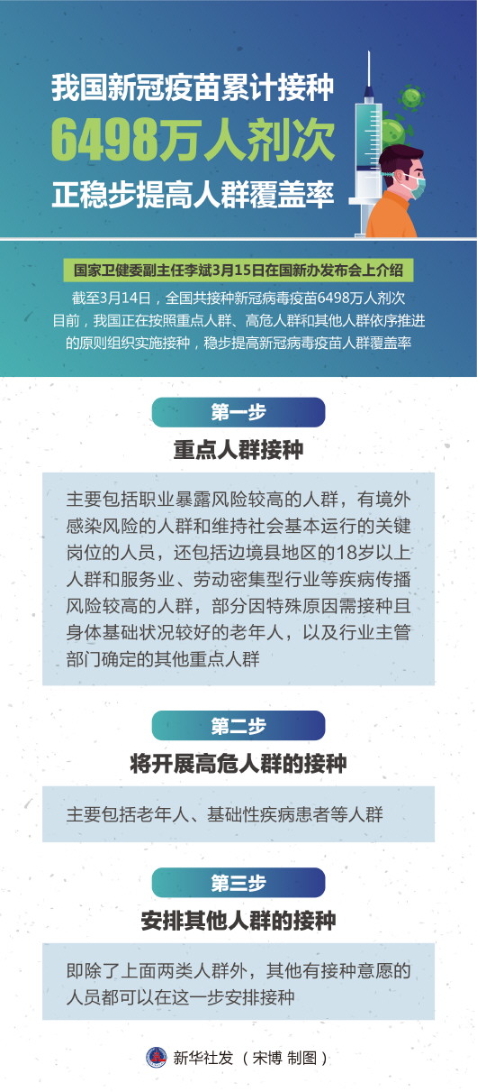 “截至3月14日,我國共接種新冠病毒疫苗6498萬人劑次。”國家衛(wèi)生健康委副主任李斌表示,目前,我國正在按照重點人群、高危人群和其他人群依序推進的原則組織實施接種,穩(wěn)步提高新冠病毒疫苗人群覆蓋率。