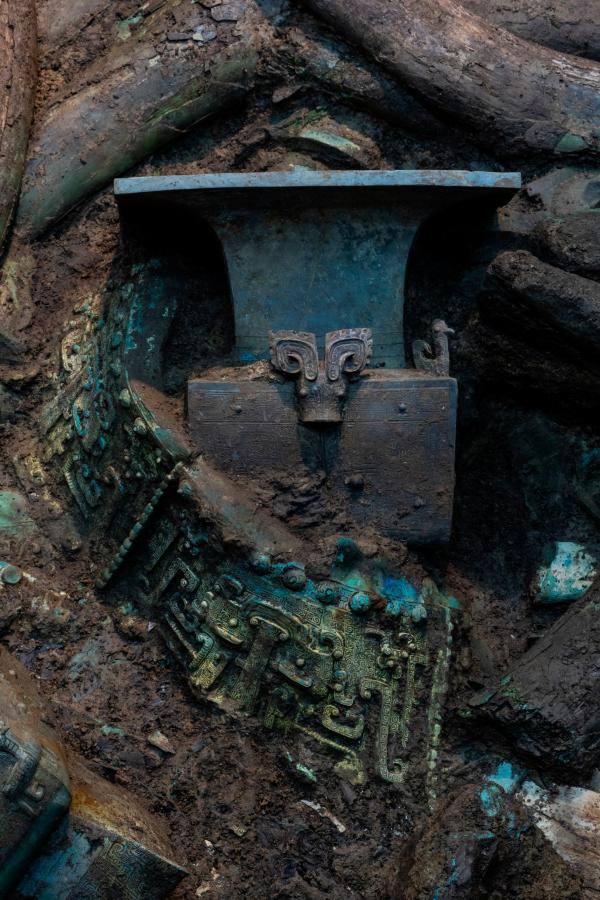 3號“祭祀坑”青銅器上的精美紋飾。(新華社記者沈伯韓攝)