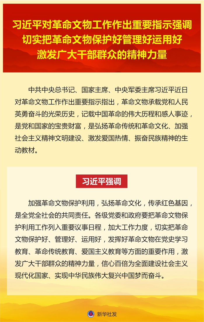 習近平強調,加強革命文物保護利用,弘揚革命文化,傳承紅色基因,是全黨全社會的共同責任。各級黨委和政府要把革命文物保護利用工作列入重要議事日程,加大工作力度,切實把革命文物保護好、管理好、運用好,發揮好革命文物在黨史學習教育、革命傳統教育、愛國主義教育等方面的重要作用,激發廣大干部群眾的精神力量,信心百倍為全面建設社會主義現代化國家、實現中華民族偉大復興中國夢而奮斗。
