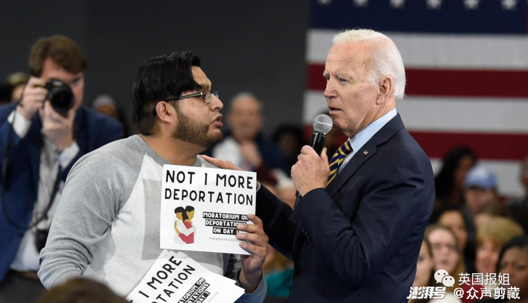 拜登競選大會上與拿著“不再驅(qū)逐出境”的支持者