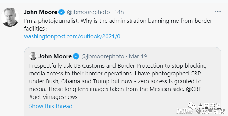 攝影記者John Moore在推特上質(zhì)問:“我謹(jǐn)請美國海關(guān)和邊境保護(hù)局停止阻止媒體訪問邊境的行為。我在布什、奧巴馬和川普的領(lǐng)導(dǎo)時期都拍攝了這一地區(qū)的新聞圖片,但現(xiàn)在你們竟然禁止記者入內(nèi)了?”