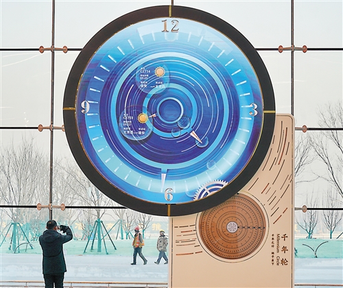 旅客在京雄城際雄安站內拍攝“千年輪”。新華社記者 牟 宇攝