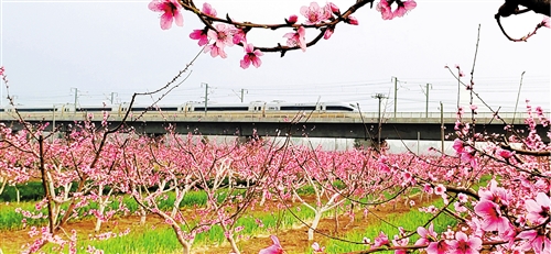 河南省寧陵縣柳河鎮桃源關村,一列動車從桃花叢中疾馳而過。近年來,寧陵縣因地制宜著力打造“旅游經濟”,助力農民增收。呂忠箱攝