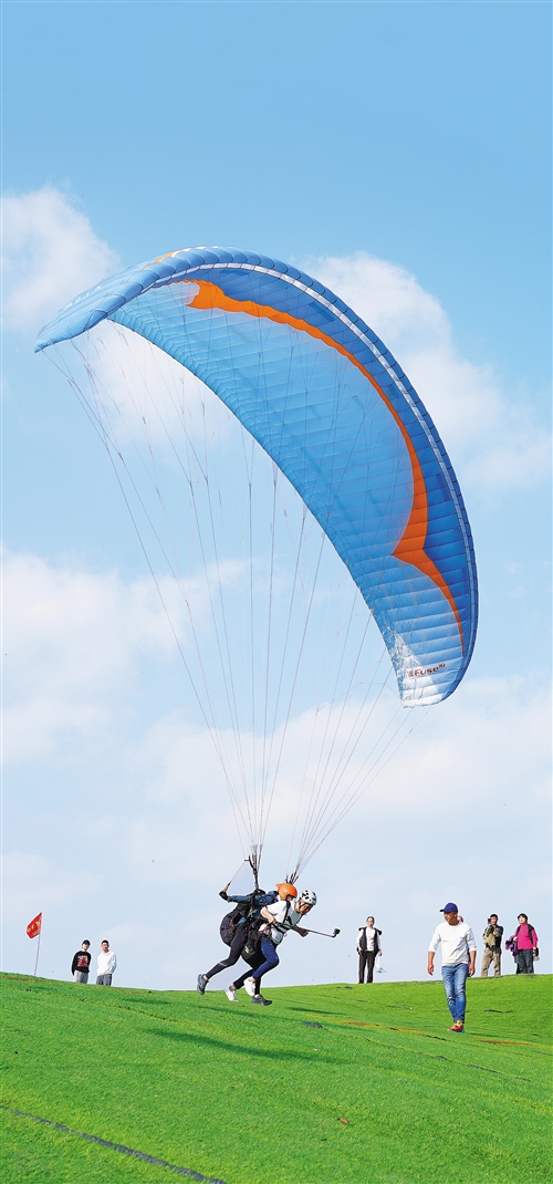 游人在重慶市北碚區天府鎮體驗滑翔樂趣。近年來,北碚區致力于打造“處處是風景、全城可休閑”的旅游休閑度假目的地。