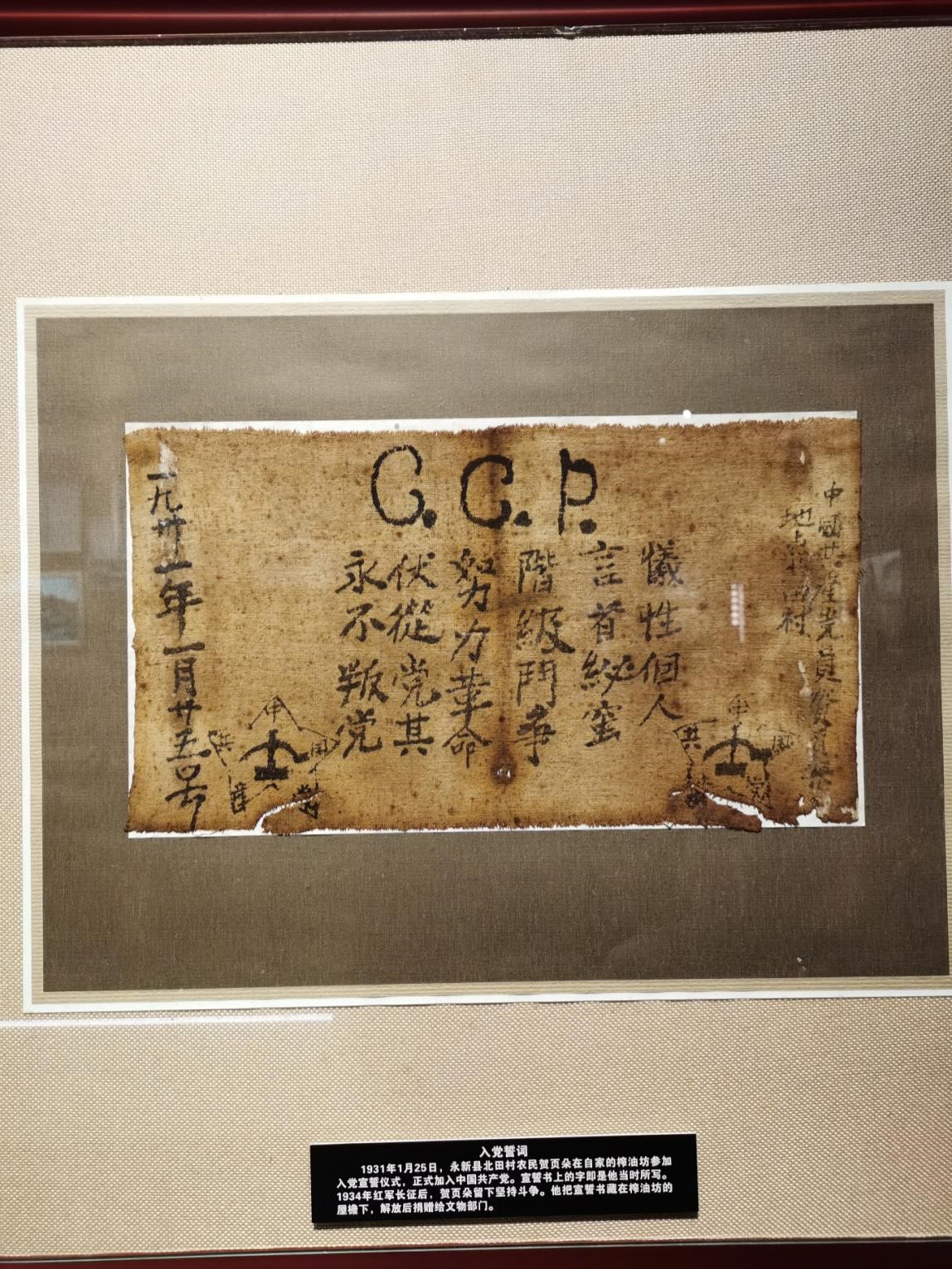 這份入黨誓詞,正是普通農民在爭取翻身解放的艱難歷程中堅定跟黨走的歷史見證。原件現收藏于中國國家博物館,復制品在井岡山博物館展出。