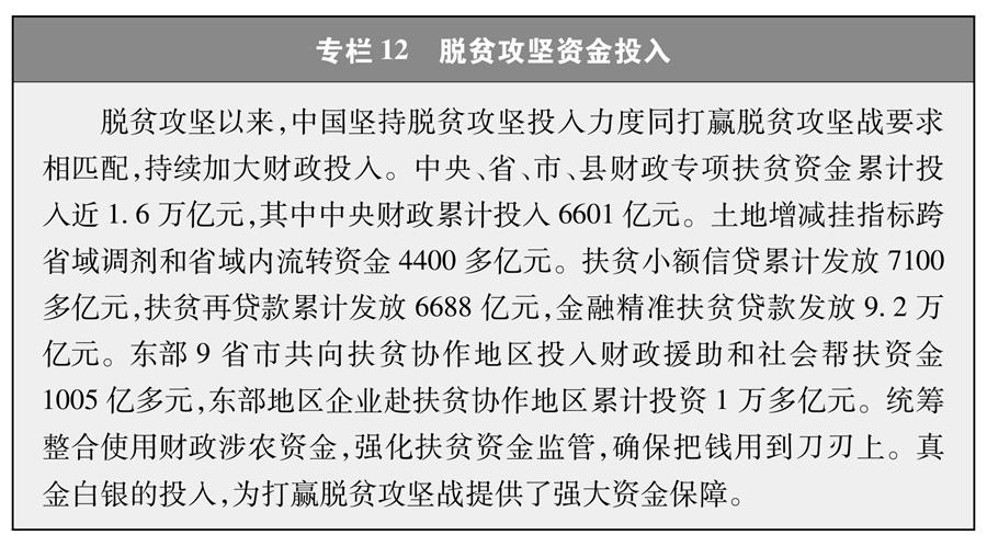 貧困地區發展條件差,貧困人口自我發展能力弱,消除貧困僅僅依靠個體、區域、民間等力量遠遠不夠,必須作為執政黨和國家的責任,上升為國家意志、國家戰略、國家行動。中國共產黨始終把消除貧困作為定國安邦的重要任務,制定實施一個時期黨的路線方針政策、提出國家中長期發展規劃建議,都把減貧作為重要內容,從國家層面部署,運用國家力量推進。幾代中國共產黨人,錨定一個目標,一茬接著一茬干。中共十八大以來,中國共產黨把脫貧攻堅擺在治國理政的突出位置,加強黨的集中統一領導,統籌謀劃、強力推進。從黨的領袖到廣大黨員干部,情系貧困群眾、心懷減貧大業,全黨目標一致、上下同心。加強頂層設計和戰略規劃,制定印發《關于打贏脫貧攻堅戰的決定》《關于打贏脫貧攻堅戰三年行動的指導意見》等政策文件,明確目標、路徑和具體措施并一以貫之抓下去。各級財政不斷加大投入力度(圖4),構建多元資金投入體系(專欄12),為減貧事業發展提供資金保障。發揮社會主義制度集中力量辦大事的優勢,廣泛動員各方力量積極參與。建立脫貧攻堅責任體系、政策體系、組織體系、投入體系、動員體系、監督體系、考核評估體系等制度體系,為脫貧攻堅順利推進提供了有力支撐。