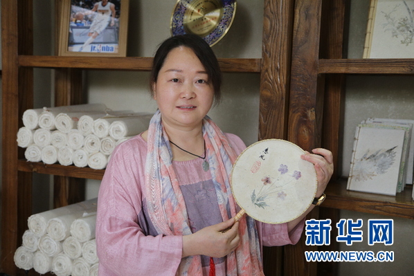 “花茂人家”文化工坊負責人張勝迪向游客展示扇子。新華網 蔡連素 攝