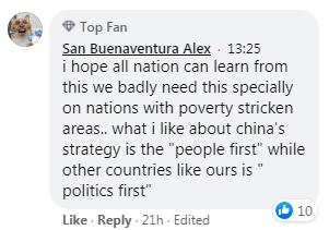 網友San Buenaventura Alex在臉書上留言說:“我希望全世界向中國學習減貧經驗,特別是一些貧困的國家。我贊賞中國‘人民至上’的理念,而不是像我們國家這樣‘政治至上’。”