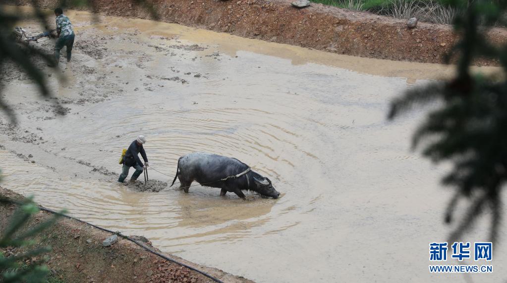 4月11日,貴州省黔東南苗族侗族自治州榕江縣八開鎮(zhèn)擺柳村村民在用耕牛耙田。