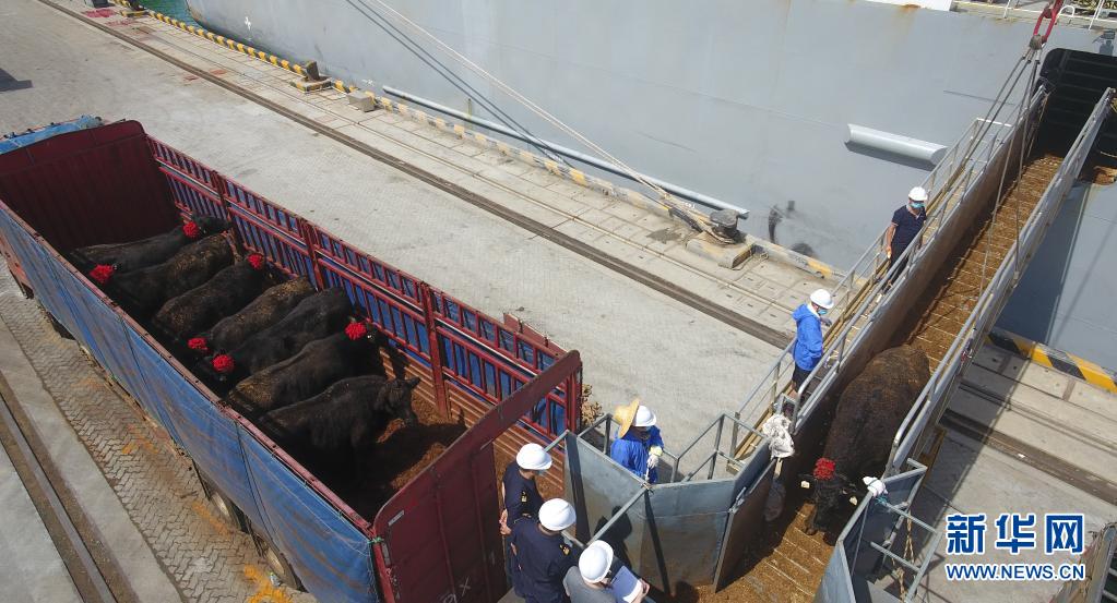 裝載來(lái)自澳大利亞的進(jìn)口活牛貨船抵達(dá)海南馬村港后,工作人員在接卸活牛(2020年7月3日攝,無(wú)人機(jī)照片)。新華社記者 楊冠宇 攝
