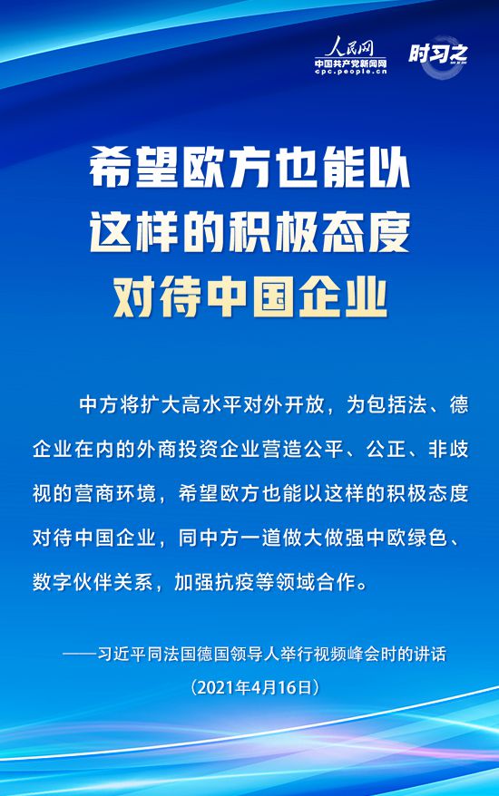【編者按】4月16日下午,國(guó)家主席習(xí)近平在北京同法國(guó)總統(tǒng)馬克龍、德國(guó)總理默克爾舉行中法德領(lǐng)導(dǎo)人視頻峰會(huì)。三國(guó)領(lǐng)導(dǎo)人就合作應(yīng)對(duì)氣候變化、中歐關(guān)系、抗疫合作以及重大國(guó)際和地區(qū)問題深入交換意見。人民網(wǎng)·中國(guó)共產(chǎn)黨新聞網(wǎng)“時(shí)習(xí)之”欄目摘錄了習(xí)近平在這次視頻峰會(huì)上的重要講話內(nèi)容,一起學(xué)習(xí)。