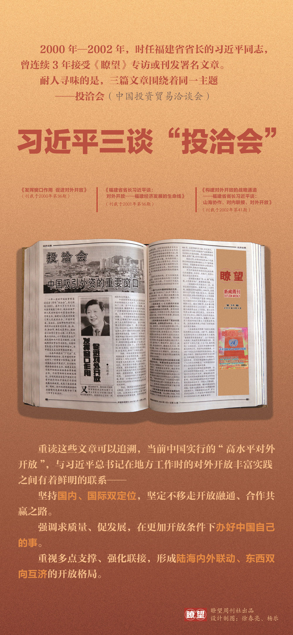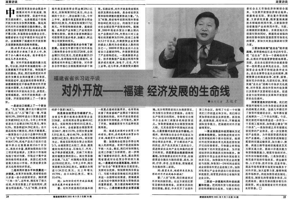 2001年9月3日,《瞭望》再次刊發專訪報道《福建省省長習近平談:對外開放——福建經濟發展的生命線》。