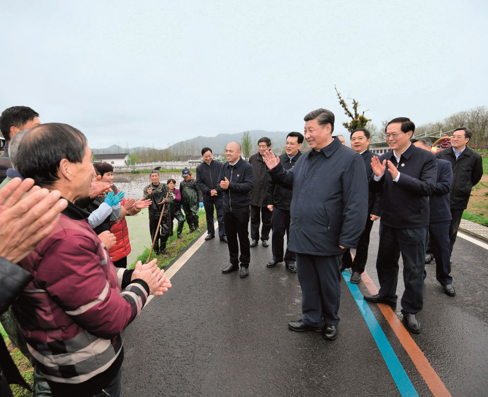 2020年3月29日至4月1日,中共中央總書記、國家主席、中央軍委主席習近平在浙江考察。這是3月30日,習近平在湖州市安吉縣天荒坪鎮余村考察調研,同正在清理荷塘的村民親切交流,詢問春耕備耕情況 申宏攝 / 本刊
