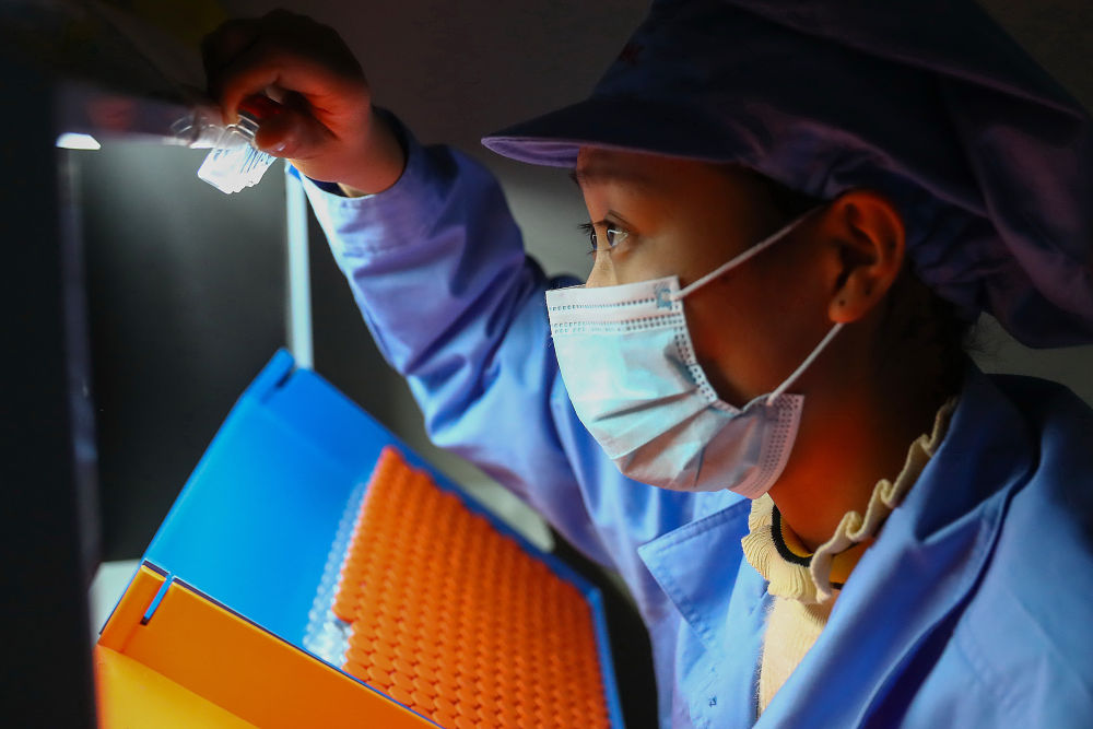 1月6日,科興中維的工作人員檢查自動西林瓶包裝線上新冠病毒滅活疫苗標(biāo)簽。新華社記者 張玉薇 攝