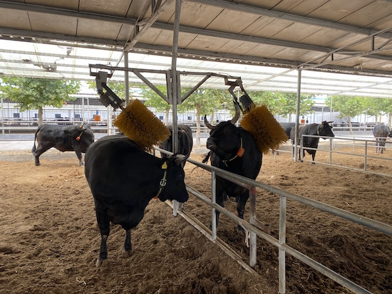 山東省淄博市高青縣黑牛小鎮里帶數字項圈聽音樂享受按摩的黑牛(淄博市委網信辦供圖)