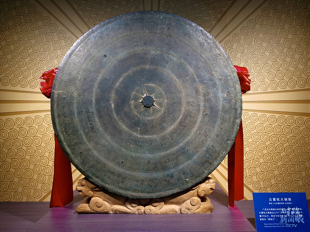 △陳列在廣西民族博物館的“銅鼓王”——云雷紋大銅鼓,面徑165厘米,重299公斤,是迄今發現世界上最大的古代銅鼓。(總臺央廣記者潘毅拍攝)