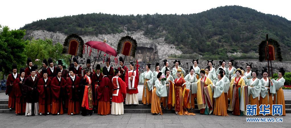 演員在洛陽龍門石窟景區(qū)禮佛臺(tái)演繹《魏孝文帝禮佛圖》(4月25日攝)。新華社記者李安攝