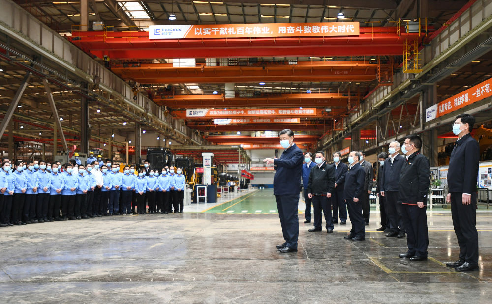 ↑2021年4月26日下午,習近平在廣西柳工集團有限公司挖掘機裝配廠,同企業職工和技術研發人員親切交談。